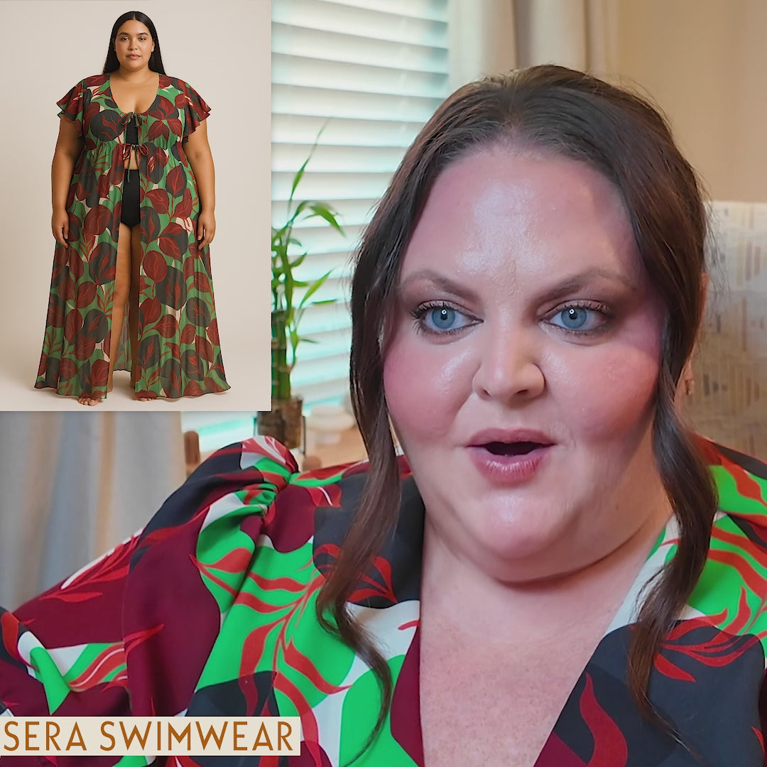 A whisper of elegance for sun-drenched days. The Media Naranja full-length cover-up is crafted from sustainable LENZING™ ECOVERO™, a silky, lightweight fabric that drapes with effortless grace. Designed with romantic ruffle sleeves and a fluid silhouette, it ties at the front to reveal or conceal with ease.